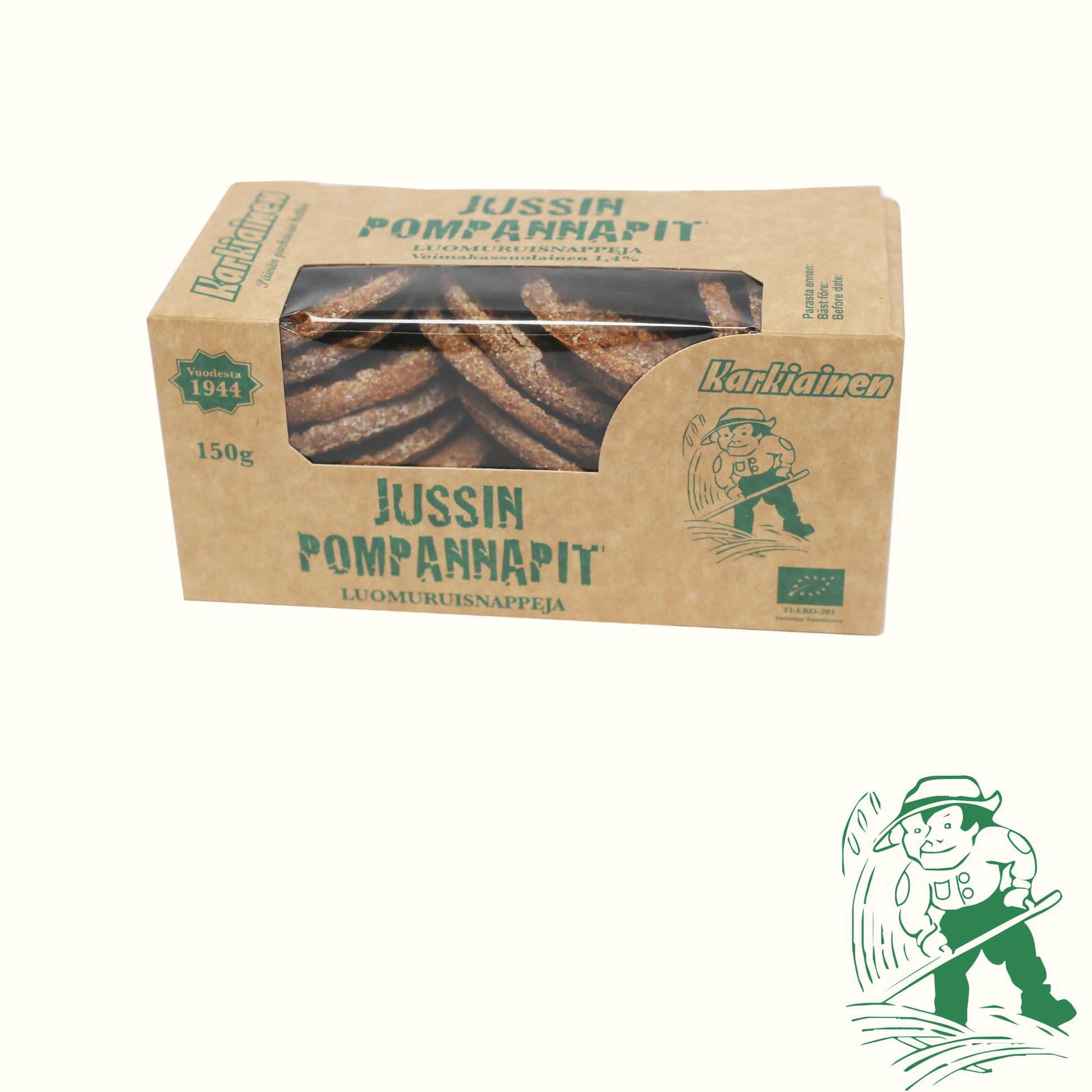 Jussin Pompannapit on läheistä sukua Jussin korpulle. Nämä maukkaat ruisnapit, kuten Jussin Korppukin, on valmistettu Karkiaisen luomuruisjuureen. Sopii esimerkiksi erinomaisesti cocktail -korpuiksi kesteille tai muihin päivän parhaisiin hetkiin.