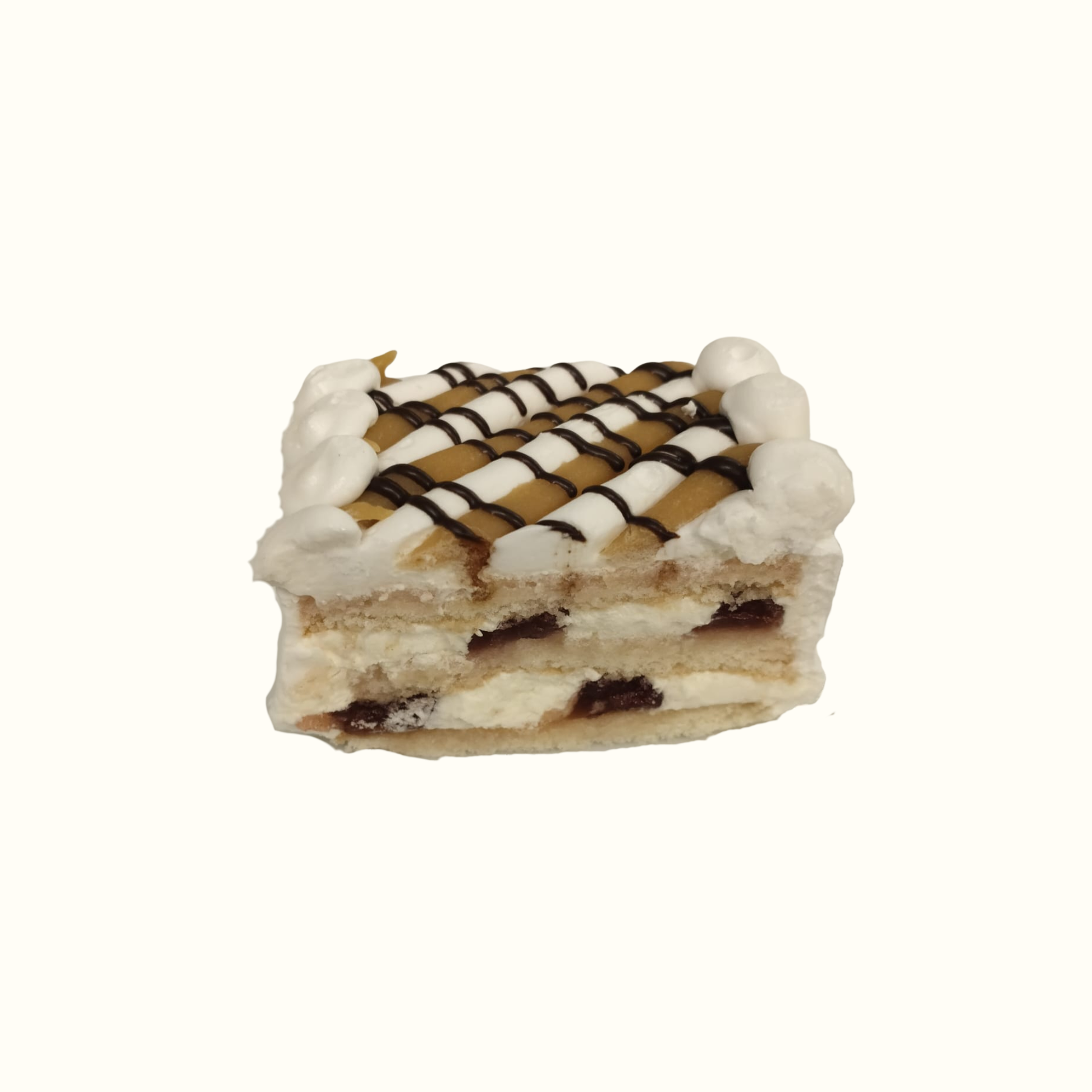 Vetopohja (VEHNÄJAUHO, KANANMUNA, sokeri, vesi, perunajauho, leivinjauhe (E450, perunatärkkelys, E500), emulgointiaine Colco UA (vesi, E471, E475, E420, E470a, etanoli, E432, E283)), sekamarjatäyte, kreemi, kinuski, suklaa.