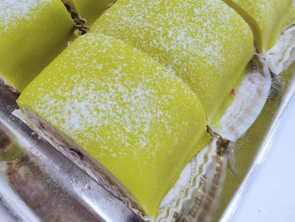 Vetopohja (VEHNÄJAUHO, KANANMUNA, sokeri, vesi, perunajauho, leivinjauhe (E450, perunatärkkelys, E500), emulgointiaine Colco UA (vesi, E471, E475, E420, E470a, etanoli, E432, E283)), vadelmahillo, kreemi, pistaasitäyte, marsipaani